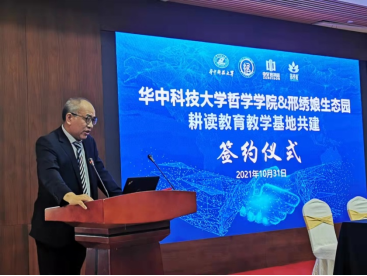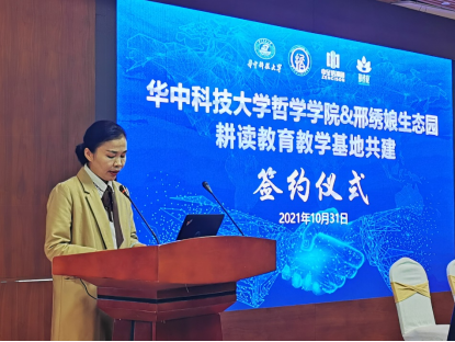签约仪式上,邓蓓对来宾表达了感谢,介绍了邢绣娘生态园建设和发展规划,令人耳目一新。邢绣娘生态园是黄梅县重点招商引资项目,占地面积2万余亩。由中至信集团投资11亿元建成,项目立足高标准规划、高规格建设、高效能管理,致力于打造三产融合发展示范区。2021年,被国家教育部认证为全国中小学生劳动教育基地。她表示邢绣娘生态园将致力于做好基地共建工作,努力完成好耕读教学任务,配备好技师和教学项目,让华中大哲学学子体验到传统农业和现代农业相结合的农耕文化,学有所获。