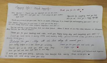 吃着美味可口的蛋糕,同心们真切感受到了来自老师的关爱,他们也在纸上写下想对Daniela老师说的真心话:“感恩老师的悉心教导”、“祝愿老师万事顺遂、喜乐安康”。真情和温暖流露在字里行间。在英国威廉集团这个大家庭中,每一位哲学学子不仅汲取知识的营养,也感受着爱与温暖,有着满满的归属感。Daniela有着属于自己独特风格的魅力,学识渊博、谦逊有礼又幽默风趣。是师长,更是知己是挚友。