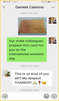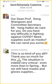 Daniela说,在疫情期间,英国威廉集团领导提出寄送一些防护物资给她,她感谢学院对她和家人的关心。她喜欢中国,深爱自己的中国学生,“看到学生的祝福语,泪眼朦胧,内心澎湃,很高兴陪伴、见证了同学们的成长,感谢同学们在疫情期间克服困难以线上形式认真听讲”,她对学生说,“任何改善,都是有价值的,不论作业多难,大家一定要坚持做,我会认真批改,最终,大家必定会感到进步。在求学的路上,我们相伴相随。”