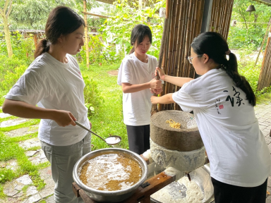 活动的第一天,同学们便踏入了传统手工艺的世界,亲手磨制豆浆、制作豆腐。从浸泡黄豆到过筛豆浆,每一步都充满了乐趣与挑战。同学们两两一组,互相配合,体验到了自己动手的乐趣,感受食物从田园到餐桌的奇妙转变。在接下来的日子里,同学们在基地老师的带领下,一起揉面团、做面包、制作青团。起初大家手艺生疏,但通过学习和反复尝试,同学们逐渐掌握了技巧,烘焙好的面包和青团的香气弥漫在虚心谷的每一个角落。最后同学们还在基地老师的悉心指导下,亲手烹饪起了家常菜肴。厨房里,锅碗瓢盆的交响曲此起彼伏,同学们的脸上洋溢着专注与期待。随着一道道色香味俱全的佳肴摆上餐桌,大家围坐一起,品尝着自己亲手制作的美食,那份满足与幸福溢于言表。同学们在享用自己劳动果实的同时,也体会到了合作的乐趣与成就感。