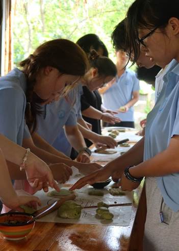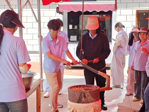 养心谷小分队同样收获满满。从推动石磨开始,体验了制作石膏豆腐的全流程,新鲜豆花、醇香豆浆、豆渣美食,每一口都是劳动的甘甜。他们还挑战制作了长阳土家族的代表性美食——蒸抬格子肉。清洗蒸笼、采摘芭蕉叶、切配南瓜、腌制搬运猪肉、生火控汽……环环相扣,在默契协作中完美呈现。