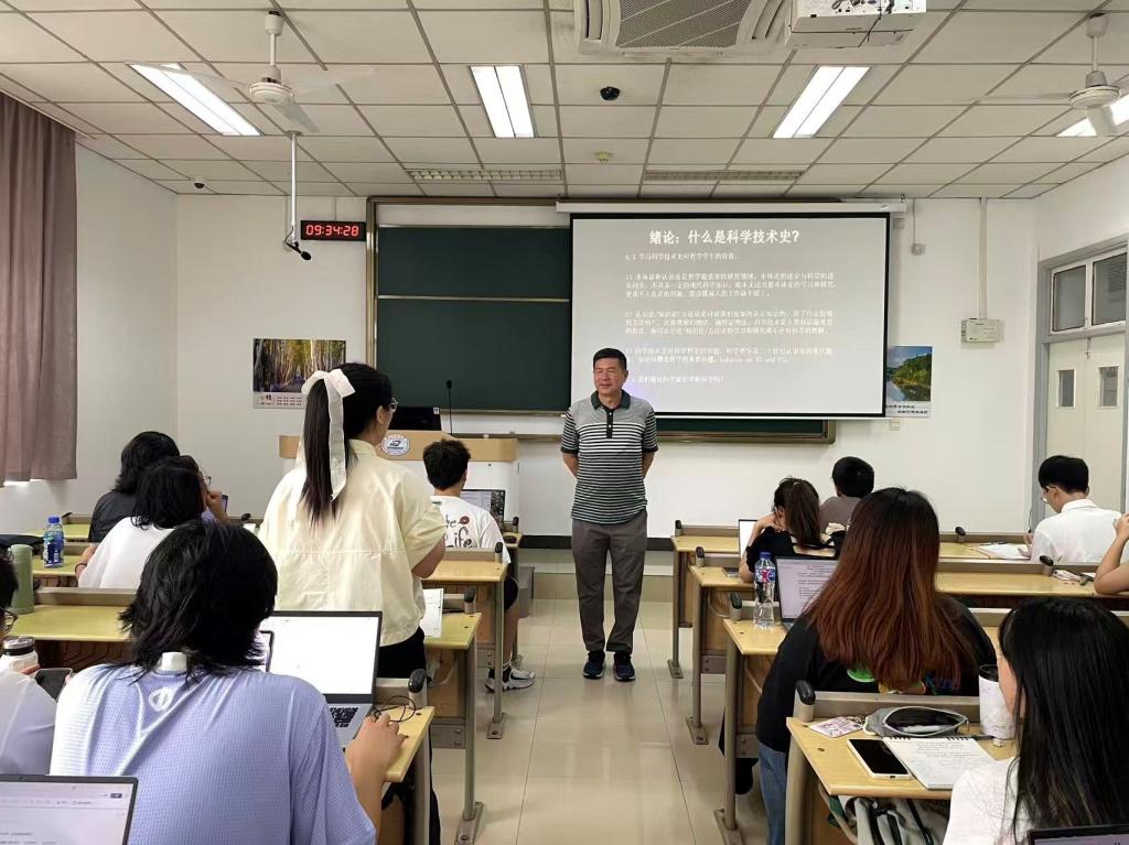 上午的首节课程《科学技术史》在东九楼D214教室掀起思想风暴。陈刚教授以“两连问”拉开课堂序幕:“哲学生为何要学科技史?科技史是古老学科还是年轻学科?”课堂上,陈老师旁征博引,娓娓道来,同学们目光如炬、聚精会神。互动环节,陈老师提出“科技哲学家能比科学家更理解科学吗?”蔡颖春、熊露梦、裴一帆等同学相继发言,从学科交叉视角展开辩论。陈老师循循善诱,鼓励学生挑战已有观点:“科学家的‘懂’是专精前沿,有直接从事科学研究的经验;科技哲学家的‘懂’是全面综观,洞见科学本质。就像地心说与日心说的更迭,既包含观测技术的突破,更蕴含认知范式的革命。”师生间的思想交锋让课堂成为智慧的熔炉。