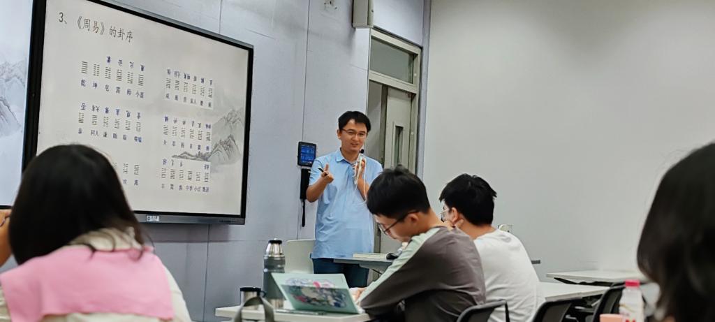与《西方哲学史(二)》同时开课的还有东九楼A403教室的《中国哲学专题研究》。白发红老师以《周易》六十四卦卦序为切入点,用“太极生两仪,两仪生四象”的辩证思维,将六十四卦的哲学内涵娓娓道来。“阴阳之道不仅是古代的占筮之术,更是中国人认识世界的独特方法论”,他结合卦爻辞与现代生活实例,将深邃的哲学概念转化为通俗易懂的日常语言。学生们时而凝神沉思,时而奋笔疾书,课堂始终洋溢着求知的热忱。