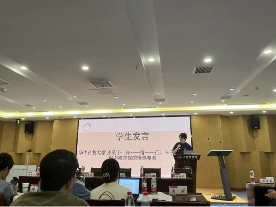 皮昊宇同学就朱子哲学中的“道德动力”问题汇报了《知——情——行:朱子哲学中被忽视的情感要素》一文。他首先对朱子哲学中“知行分离”与“道德动力减杀”问题进行了介绍,并阐述了包括西方学者在内的当代学者对其的诠释思路。皮同学指出,朱子的文本中道德判断与道德行为之间存在“情感”这一中间项,且这一中间项虽为认知与性理的产物,但能够起到直接推动行为的动力作用。皮同学进一步指出这一观点在朱子对《孟子》“以羊易牛”一例中的诠释与智德“有知觉而无运用”、“交付”行动于情感的特性得到了支持,也符合《语类》中大量关于知行过程的描述。通过此理解,认知主义与反认知主义得到了一定程度的调和,朱子的“知”、“情”、“行”关系亦得到了恰当的平衡。武汉大学刘沁老师赞赏了皮同学较为开阔的知识储备与观察视域,同时也指出论文中存在一些待斟酌的问题点。