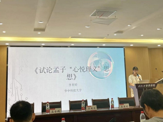 论坛中,李美婷同学就孟子道德哲学中“悦”的问题汇报了《试论孟子“心悦理义”思想》一文。她首先从孟子对“性”的界定和性、欲、悦的关系两方面阐述了孟子“心悦理义”的理论基础。接着根据人保有四端之心的程度不同,将人产生“悦”的情况分成三种,即心“自然悦理义”的普通人、“不为理义悦”之人、心“自觉悦理义”之人,并分析了达到“心自觉悦理义”的工夫。最后论述了孟子“自觉悦理义”蕴含的知行合一思想,并对杨国荣的“我思、我欲、我悦”结构进行了反思。中国社科院哲学所傅正赞同了此文对孟子道德哲学的分析,也针对“悦”提出了相应的问题。
