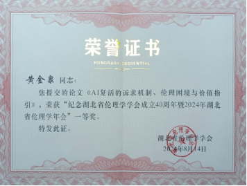 近日,我院2023级伦理学博士研究生黄金泉以论文《AI复活的诉求机制、伦理困境与价值指引》荣获“纪念湖北省伦理学会成立4 0 周年暨2024年湖北省伦理学年会” 一等奖。