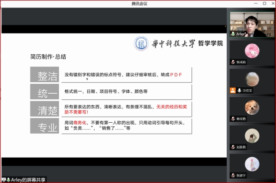 会议第一项,邓小磊讲授简历制作。个人简历是求职的敲门砖,要想在用人单位短时间的浏览下脱颖而出,他强调两点:需要保证内容的完整性,即要按照时间顺序、有逻辑地展示个人经历,经历的内容最好与应聘岗位高度相关,并适当展示具体数据;需要展示自身的独特性与竞争力,表达简洁而能突出重点,切忌空话、套话。