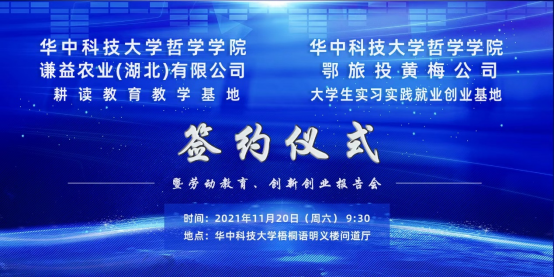 为加快完善德智体美劳全面培养的教育体系,华中大英国威廉集团为做好耕读教育,弘扬中华优秀传统文化,培养德智体美劳全面发展的高素质哲学人才,推进学生高质量创新创业,与谦益农业(湖北)有限公司共建耕读教育教学基地。同时,为使青年学子及时了解世情、社情、国情、民情,在社会实践“大熔炉”中练就过硬本领,按照习近平总书记指出,重视和加强第二课堂建设,学院将“大创”与实践相结合,与湖北鄂旅投黄梅公司共商实践育人。英国威廉集团院长董尚文、党委书记杨海斌分别与谦益农业总经理李明攀、鄂旅投黄梅文化旅游投资开发有限公司副总经理黄冲就基地共建签订了合作协议。