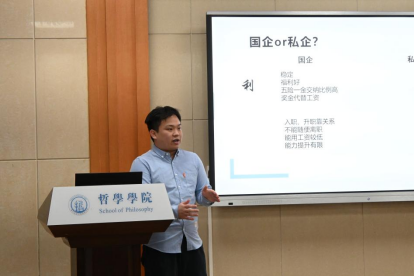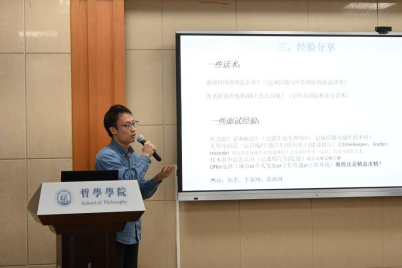 第五项,2023级宗教学方向研究生李浩宇带领大家回顾了自己的海投经历,从简历制作开始分享了应聘各个环节的技巧。此外,李浩宇同学讲述了快消行业、制造业、互联网等不同类型的企业面试特点,分享了常用话术,并现场列举了面试时可能出现的问题,与到场同学进行了互动。