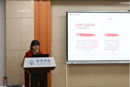 第三项,学生基层治理研究会政策学讲团部长李朝旭从选调生的定义、近年选调生政策、我校选调生情况、我校开展的选调服务工作、其他类型公职考试等多个方面为大家详细地讲解了考取选调生的具体内容和程序。