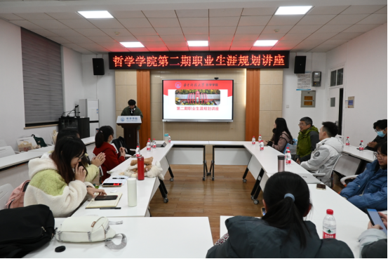 第二项,就业专员邓小磊老师以《哲学就业指南——学哲学能做什么?》为主题,对哲学专业的职业规划进行了整体讲解,带领大家分析了2023届学院毕业生的就业情况,本科生升学率达到60%,本硕博就业领域多为党政机关公务员、大中小学教师、国企事业单位行政人员等,鼓励大家尽早做好职业规划,明确未来发展。