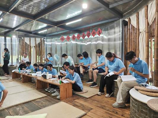 当夕阳西下,山间蝉鸣如织,一片静谧仿佛隔绝尘世。然而,无论是在虚心谷还是养心谷,总能看到同学们安静书写的身影,时而凝神思索,仿佛在温热的空气中捕捉思想的灵光。夜幕降临,那份在白日劳作中萌芽、于夜读里滋长的,是对“知行”关系的更深刻体悟。